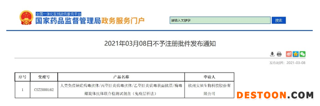 3月11日讯 3月8日,国家药品监督管理局政务服务门户更新《不予注册批件发布通知》,杭州安旭生物科技股份有限公司(简称“安旭生物”)关键产品——人类免疫缺陷病毒抗体/丙型肝炎病毒抗体/乙型肝炎病毒表面抗原/梅毒螺旋体抗体联合检测试剂盒(免疫层析法),正式给予不予注册批件。