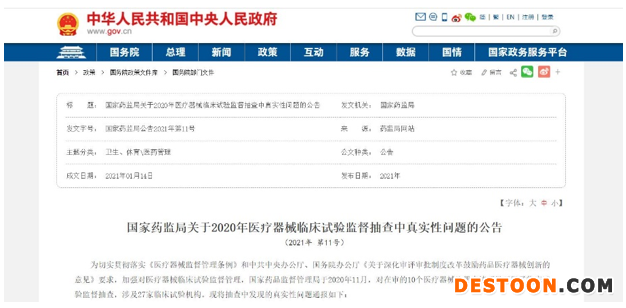 为加强对医疗器械临床试验监督管理,国家药品监督管理局于2020年11月对在审的10个医疗器械注册申请项目开展了临床试验监督抽查,涉及27家临床试验机构。