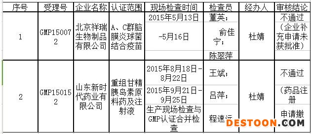 通知表示,根据国家食品药品监督管理总局的有关规定,经现场检查和审核,北京祥瑞生物制品有限公司因补充申请未获批准、山东新时代药业有限公司因药品注册申请撤回,本次认证申请不通过,现予公示。公示期为 10 个工作日,自 2016 年 6 月 20 日至 2016 年 7 月 1 日。