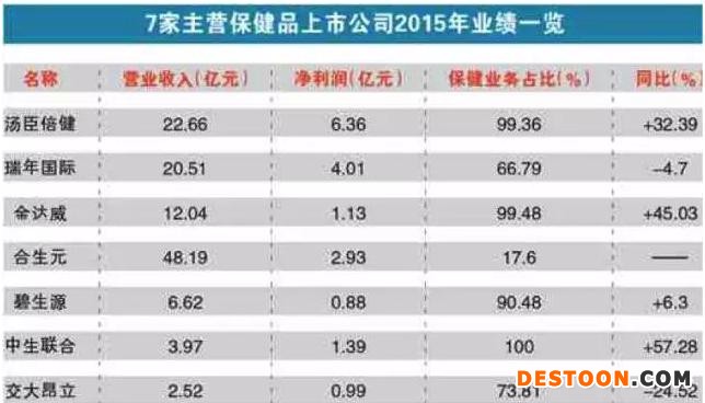 主营保健品上市公司是指其所拥有的保健食品与进口膳食营养补充剂的营业收入占公司整体营业收入在50%以上的上市公司。据2015年年报显示,7家排名靠前企业依次为:汤臣倍健、瑞年国际、金达威、合生元、碧生源、中生联合和交大昂立。